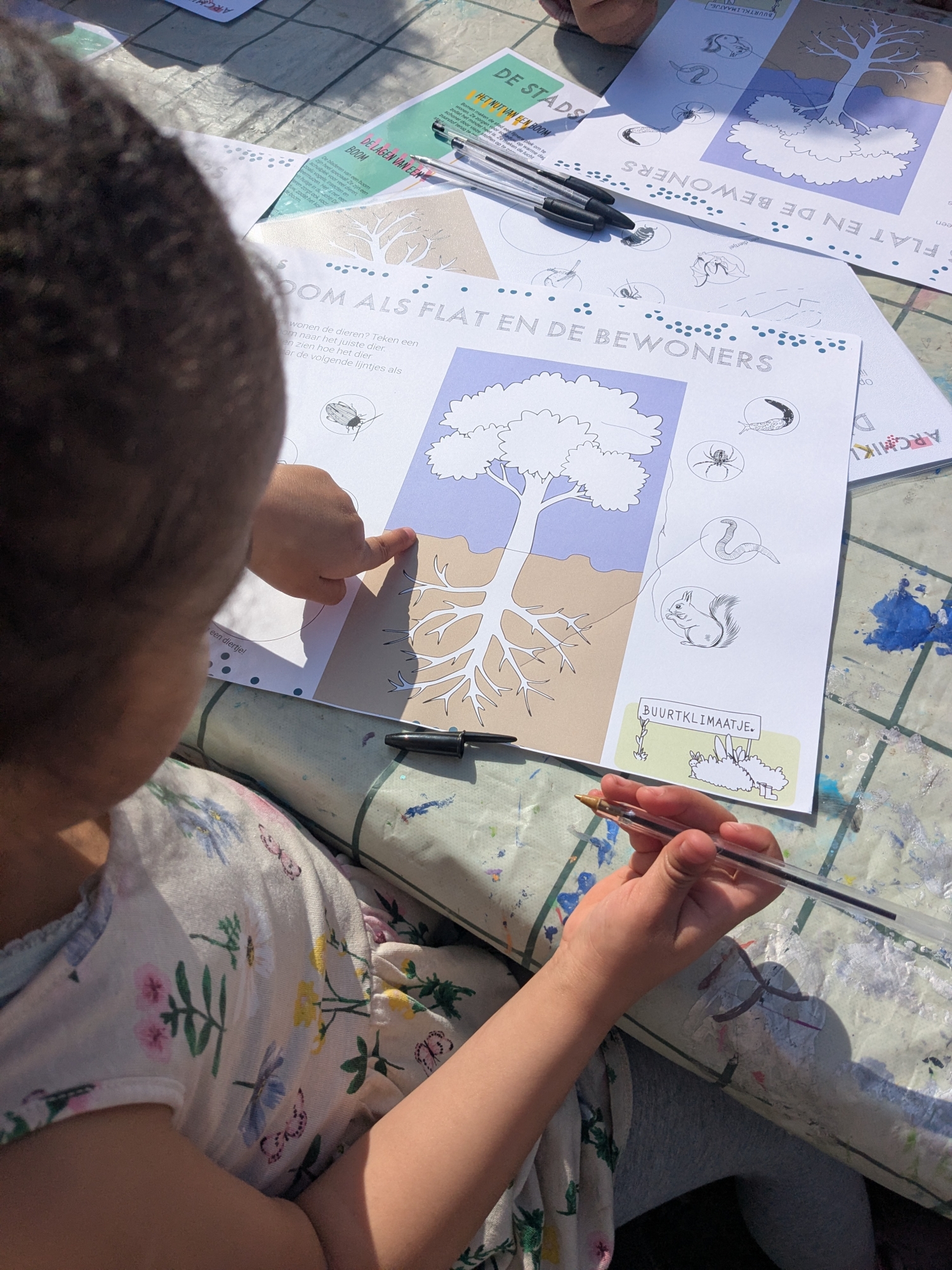 De workshop begint met het lezen van het infoblad over het thema Groen. Waarom is groen in de stad zo belangrijk? Op de achterkant ontdekken de kinderen van alles over de stadsboom: welke dieren en bewoners erin leven, wat wortels doen, en waarom een boom zo’n belangrijke rol speelt in de stad. Daarna gaan we op bomenspeurtocht en ontdekken we welke bomen er in onze omgeving staan; de kastanje, de prunus of een linde? En als laatste gaan we ontwerpen! Hoe ziet ons plein, straat, of wijk eruit met meer van deze prachtige bomen?