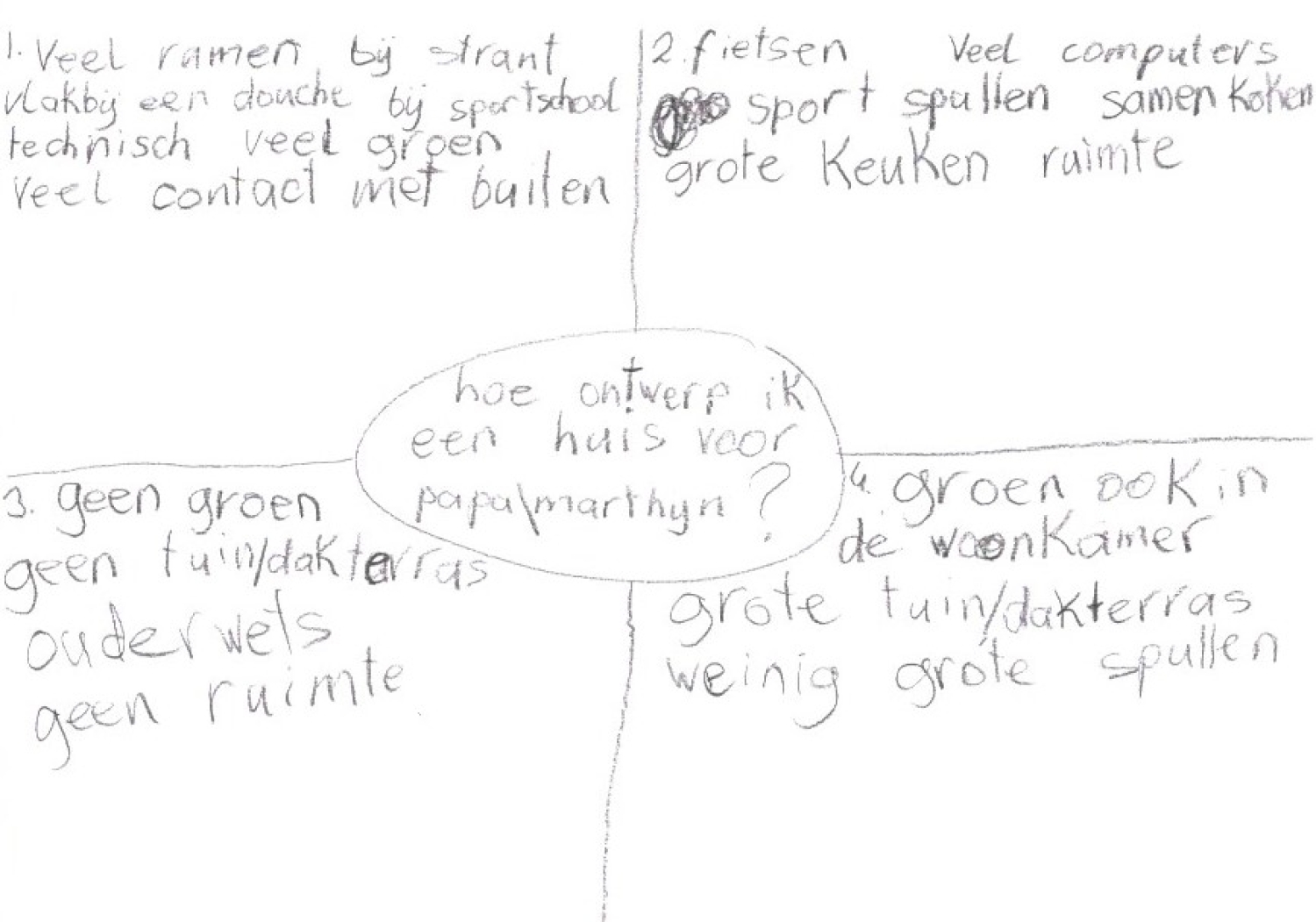 3. Maak je vel papier klaar voor de brainstorm. Schrijf in het midden van je vel: ‘Hoe ontwerp ik een huis voor ….? Deel de rest van het vel in vieren door strepen te trekken.