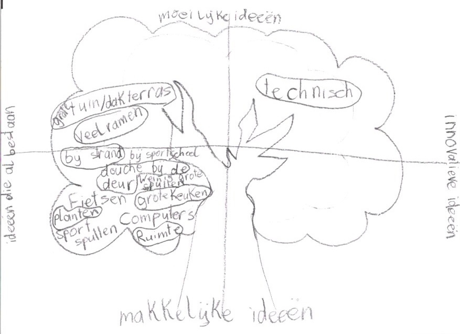 - Teken een boom. Verdeel je vel in 4 vakken. Knip je ideeën uit of schrijf ze over op de boom. Hoe lager het idee hoe makkelijker te bouwen, hoe hoger hoe ingewikkelder te bouwen. Links plak of schrijf je de ideeën die al bestaan. Rechts schrijf je innovatieve ideeën.
