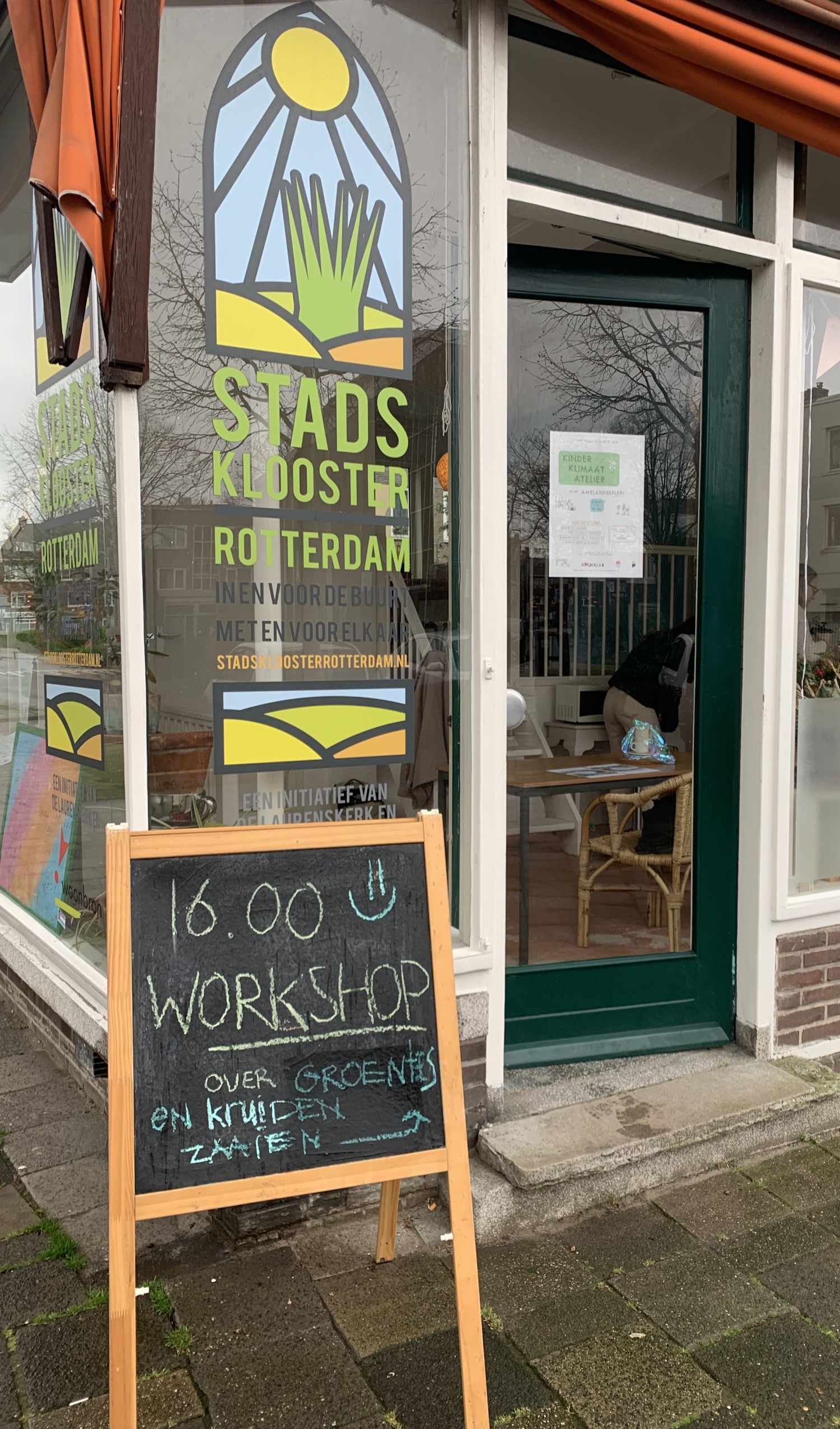 Het atelier is altijd buiten, tenzij het met bakken uit de hemel valt. Dan kunnen we terecht in het Stadsklooster.