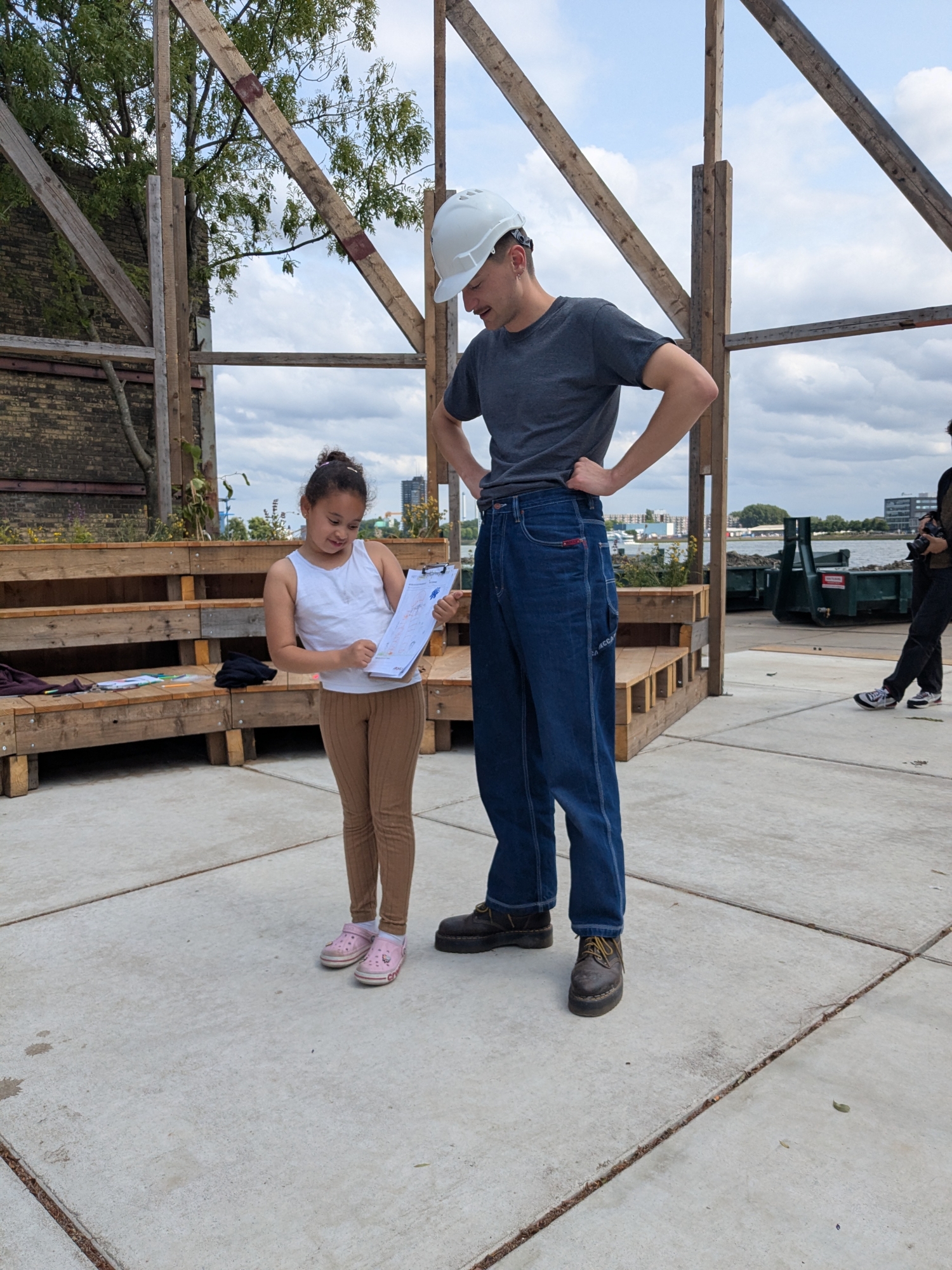Daarna was het tijd om zelf aan de slag te gaan. Met het thema sport en spel werd er gebrainstormd, geschetst en bedacht: van een wipe-out op het water tot picknickplekken in de schaduw. In de circulaire houtwerkplaats van Buurman leerden de kinderen werken met hergebruikt hout en brachten ze hun ideeën tot leven.